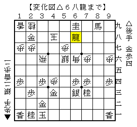 △6八龍以下▲5八銀△5九龍▲4七玉△4八金▲4六玉△4五歩で、ソフトの評価値-99988で後手勝勢。