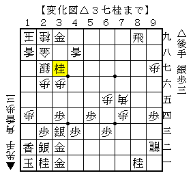 △3七桂以下▲同桂△3八銀▲同銀△同金で、ソフトの評価値-99980で後手勝勢。