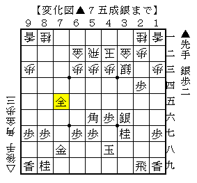 △7五成銀に△3五歩なら▲4七銀△3六金▲8三角成△5一飛で、ソフトの評価値+270で互角。