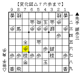 なお▲7六同成銀に以下△4六金▲4七銀△8二歩▲6五馬△6四歩▲7四馬で、ソフトの評価値+279で互角。