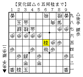 △6五同桂と後手の飛車が隠れる形ですが、特に△8八角成と馬を作れば角取りの先手になります。