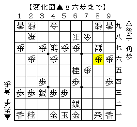 △8一飛に▲8六歩としていつでも▲6六歩からの桂取りがあるので先手が少し指しやすいようです。