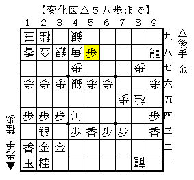 ▲5六歩と受けて△同香なら▲5七歩はありますが、そこで△5八歩です。ソフトの評価値-749で後手優勢。