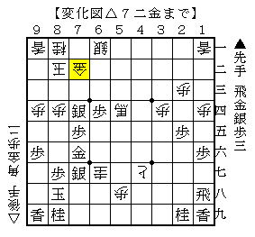 △7九角を含みに後手は△7二金と受けます。