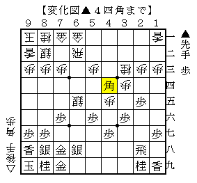 ▲4四角以下、△7六銀▲3三角成△6七歩▲5九銀△6六角で、ソフトの評価値+362で先手有利。