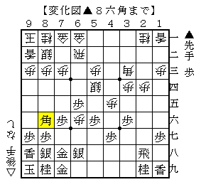 ▲8六角以下、△6五銀▲5三角成△5六銀で、ソフトの評価値+410で先手有利。