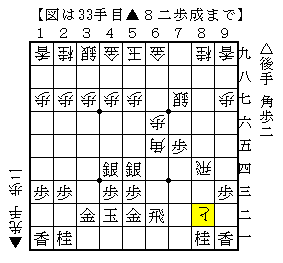 本譜は以下、△6五歩▲同角△7五歩▲8四歩△同歩▲8三歩△6二飛▲8四飛△5四銀▲8二歩成で、ソフトの評価値+8で互角。