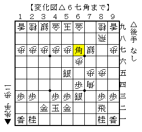 △6五歩では△5五銀▲7四角△6七角の方が良かったようです。ソフトの評価値-654で後手有利。