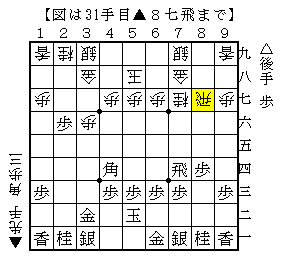本譜は以下、△7七角成▲同桂△4四角▲8五飛△8四歩▲8七飛で、ソフトの評価値+389で先手有利。
