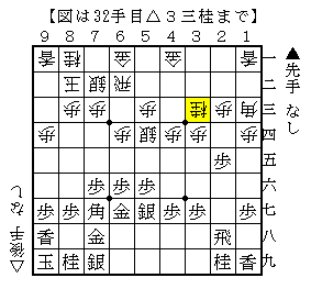本譜は以下、▲2四歩△同角▲5五歩△6三銀▲3六歩△5二金左▲8八銀で、ソフトの評価値+29で互角。
