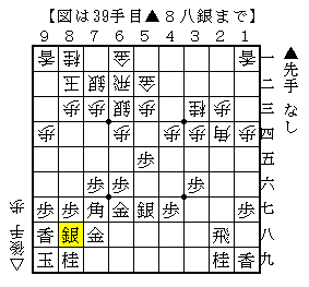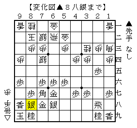 ▲8八銀以下、△8四歩▲1六歩△8三銀上▲1五歩△同歩▲同香△6八角成▲同角△1五香▲1三角成で、ソフトの評価値+321で先手有利。