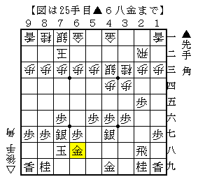 本譜は以下、▲5六歩△2二飛▲3六歩△4二銀▲4六歩△4三銀▲4七銀△3三桂▲6八金で、ソフトの評価値+57で互角。