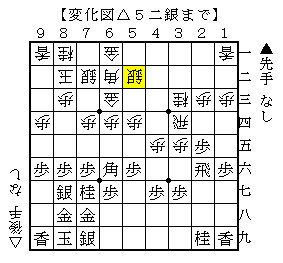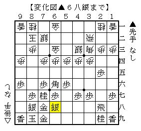 一例として▲6八銀以下、△3五歩▲1六歩△5一角▲2六飛△3四飛▲8六歩△3三桂▲8七銀△6二角▲8八金上△4五歩▲7九銀△5二銀で、ソフトの評価値-69で互角。