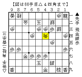 ▲6六銀以下、△6九角▲4八玉△3六桂▲3七玉で、ソフトの評価値+2476で先手勝勢。