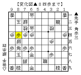 先手玉は3段目まで上がって後手が手厚く指しているので、結構危ないのですが、▲8四歩と垂らして銀が入れば▲8三銀と見せる展開です。