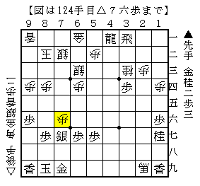 本譜は以下、▲6一飛成△7七歩成で、ソフトの評価値-499で後手有利。