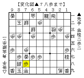 後手は受けに余裕があるうちに、△7七香で食いつく形も▲7八歩で受けに回ります。