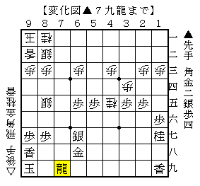 先手の手は▲7一同龍か▲7三角のどちらかと思うのですが、本譜はあまり良くなかったようです。