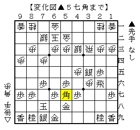 なお、▲5七角で▲3六飛もありますが、△3四歩▲2六銀△2八角で、ソフトの評価値+26で互角。