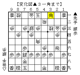 本譜は以下、△3五歩▲6六銀△4四銀▲5六歩△5四角▲7七飛△4五角で、ソフトの評価値+281で互角。