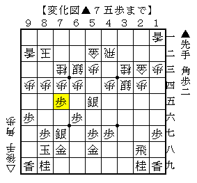 △8五歩▲6六銀△5四角▲7七飛△4四歩▲5五銀△4三角▲2六角△4五歩で、ソフトの評価値-127で互角。