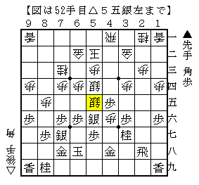 本譜は以下、▲2八飛△5二玉▲6六歩△4一飛▲4五歩△5五銀左で、ソフトの評価値-143で互角。