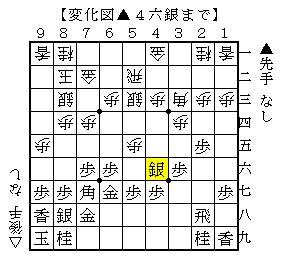 ▲4六銀に△4四銀なら、▲5九角△5一角▲1六歩△2二飛▲6五歩で、ソフトの評価値+156で互角。