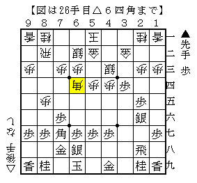 先手は▲2六銀から▲3五歩に対して、後手は△3三角が△4二角から△6四角としたのですが、次の一手はあまり良くなかったようです。