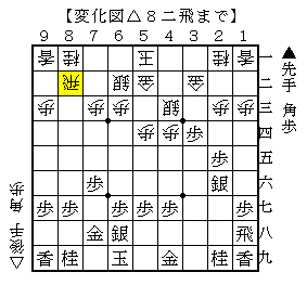 △8二飛に▲7七銀なら、△2七角▲4八飛△4九角成▲同飛△3八金▲5九飛△4八金で、ソフトの評価値-785で後手有利。