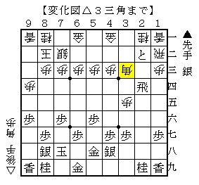 △3三角に▲2八飛と引いて角交換して後手は△2二歩と打ちます。