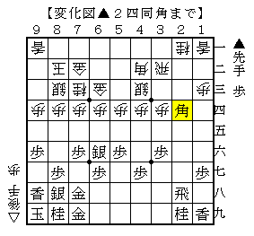 △4二角は次に△6五歩▲7七銀△6四角を狙った手ですが、その前に▲2四歩と仕掛けます。