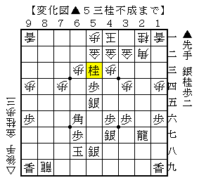 実戦では、先手は2六の飛でなく2八の飛だったので変化手順です。
