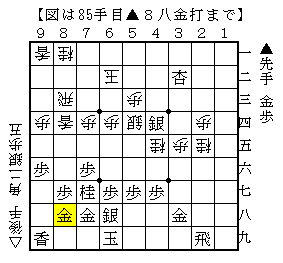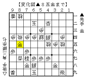 金と香車の交換で先手少し駒損ですが、▲8五金がいると後手陣も薄いので神経を使う将棋になります。