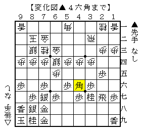 対抗形の持久戦で▲4六角のような手がたまに出ますが、説明するのが難しい手で、間合いを図ったとか1手様子を見たような手ですが、▲4六角に特別な狙いはありません。