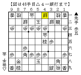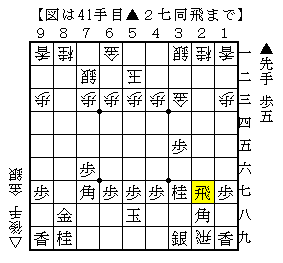 本譜は以下、△3二銀▲4五桂△4四金▲2二飛成△4一銀打で、ソフトの評価値+111で互角。