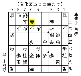本譜は以下、▲5七角△6二金▲3五角△2一飛▲5八金右△4三銀で、ソフトの評価値+251で互角。