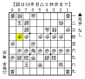 本譜は以下、▲2九飛△8三銀▲8五歩△同歩▲同桂△8四銀左▲8六歩△7二金で、ソフトの評価値-211で互角。