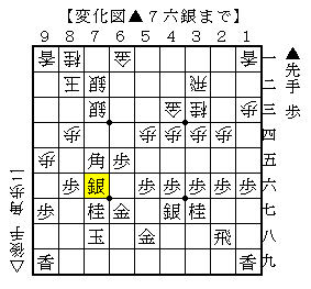 ▲6六角と自陣角を打ったのであれば、歩を交換してからの▲7六銀は自然な1手でした。