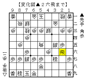 再度の△5五角に▲4六歩~▲2六飛がうまい受けで、これでいい勝負のようです。
