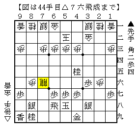 ▲6六角以下△8九龍▲1一角成△8七歩成▲5六香△4一桂▲7九歩で、ソフトの評価値+43で互角。