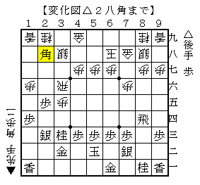 △4四角以下▲2九飛△2四歩▲同飛△2二銀▲7七角△2三銀で、ソフトの評価値-38で互角。