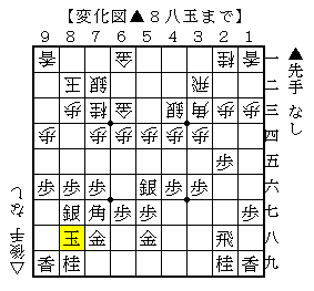 後手の△8五飛と△7三銀とした組み合わせがやや珍しい駒組みですが、後手の狙いがいまひとつ分かっていませんでした。