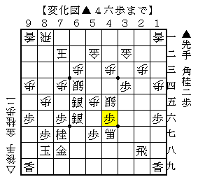 また▲4六歩に△同銀なら、▲4五角△4四歩▲6四銀△4五歩▲8四桂で、ソフトの評価値+1061で先手優勢。