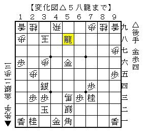 △5八龍では△6八龍とすれば▲4八金としても龍取りにはなりませんが、龍はできるだけ玉に近い方が威力を増します。