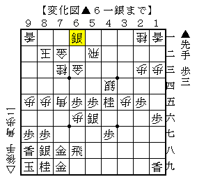 上図は、先後逆で角換わり腰掛銀からの進展で▲6九飛と2九の飛車が6筋に回った局面。ソフトの評価値-234で互角。