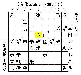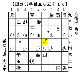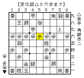 △3五歩▲同歩△3六歩▲6六飛△5二玉▲7五歩△3七歩成▲同金△8四角で、ソフトの評価値-347で後手有利。