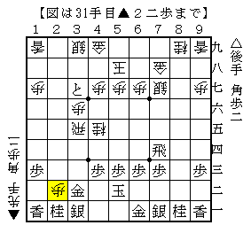 この手順は、△2四角には▲2一歩成△3五角▲同歩で、後手が桂損して次に▲3一とがあるので△4二銀としますが後手が忙しいです。