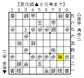 この手順は△3四歩から△2二銀として局面をおさめる指し方ですが、▲8三角が気になります。