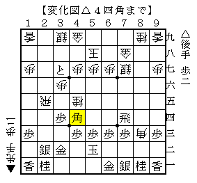 △4四角以下、▲7四角成△同歩▲2三歩△同銀▲同飛成△同金▲3一飛△2二金▲2三歩△4七と▲同玉△2七飛▲5八玉△4七角▲6八玉△2三飛成で、ソフトの評価値-572で後手有利。