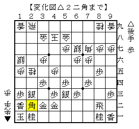 この手順は、△2二角と先手が角道を開けるのを事前に受けた手です。
